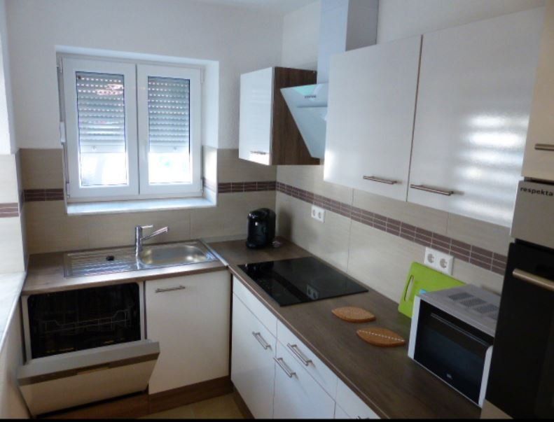 Küchenzeile,Kühlschrank, MikrowelleKaffeemaschine, Backofen, Cerankochfeld, Spülmaschine, Kochutensilien,Löffelfertig,Reinigungsmittel